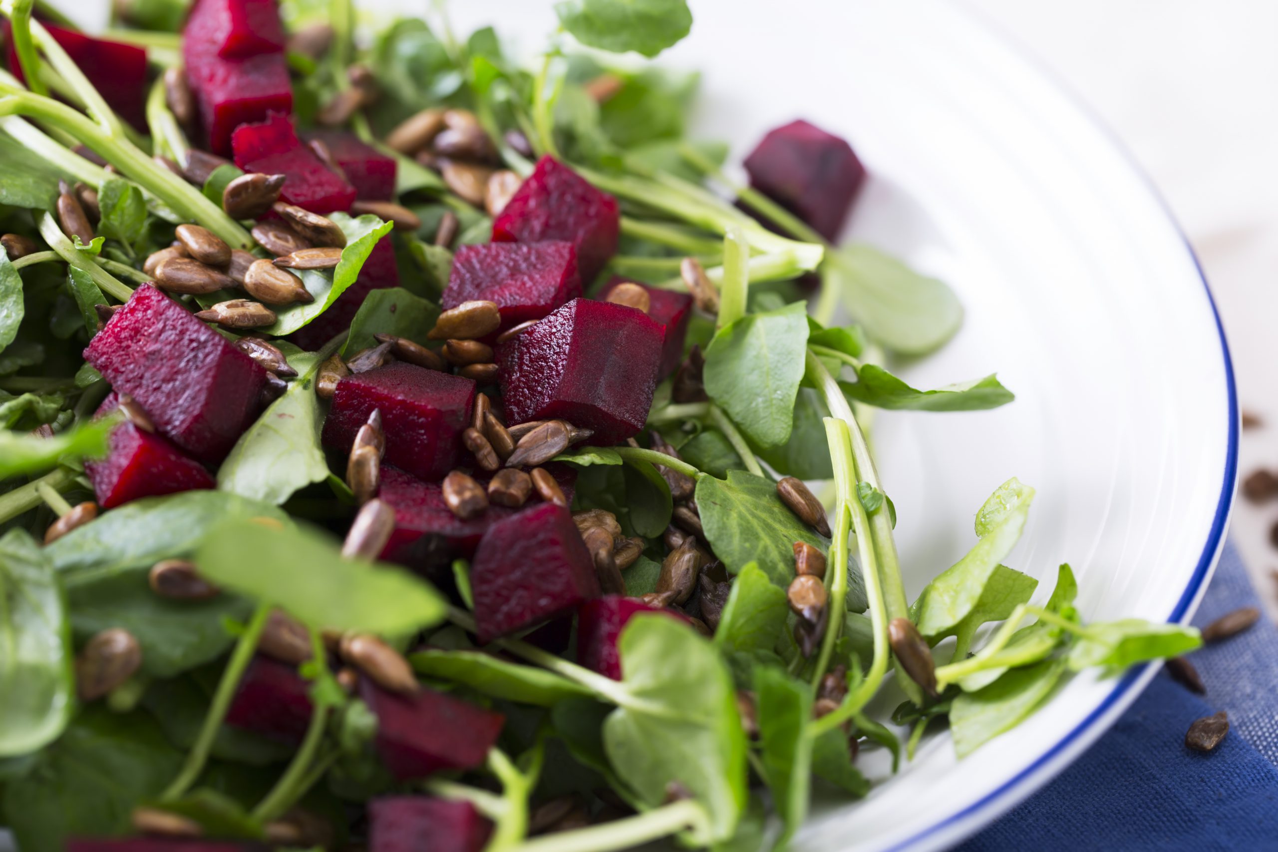 סלט סלק ופולי חומוס ברוטב טחינה-עשב שעורה