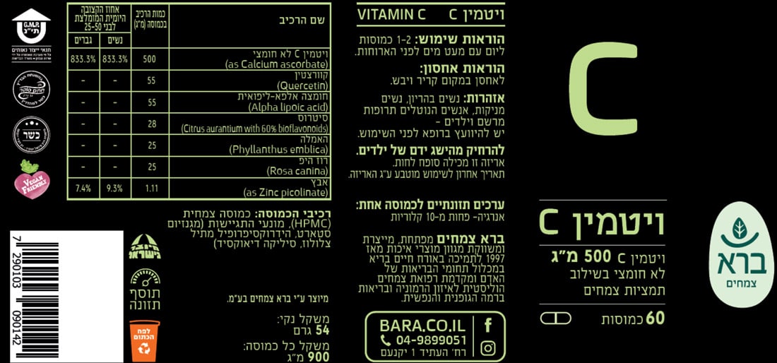 ויטמין C של ברא מסדרת הוויטמינים והמינרלים, מכיל 500 מ”ג ויטמין C, בשילוב נוגדי חמצון ותמציות צמחים. הרכיבים הצמחיים מוסיפים מגוון טבעי של רכיבים המקיימים ביניהם יחסי גומלין שמגביר את עוצמת התכשיר. ויטמין C הינו ויטמין מסיס במים, אשר יש לצרוך אותו במזון או כתוסף שכן הגוף אינו יודע לייצרו. הוויטמין משתתף בלמעלה מ-300 תהליכים ביולוגיים שונים בגוף. פעילותו החיונית ביותר של ויטמין C בגוף היא זו של נוגד חמצון. ולכן יש לו תפקיד מרכזי בתהליכי בריאות וחולי. הגוף אינו אוגר ויטמין C בכמות מספקת, ונדרשת צריכה נאותה מהמזון או תיסוף למניעת מחסור.