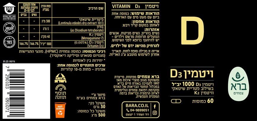 | ויטמין D3 Vitamin) D3) | 1000 יחב”ל |