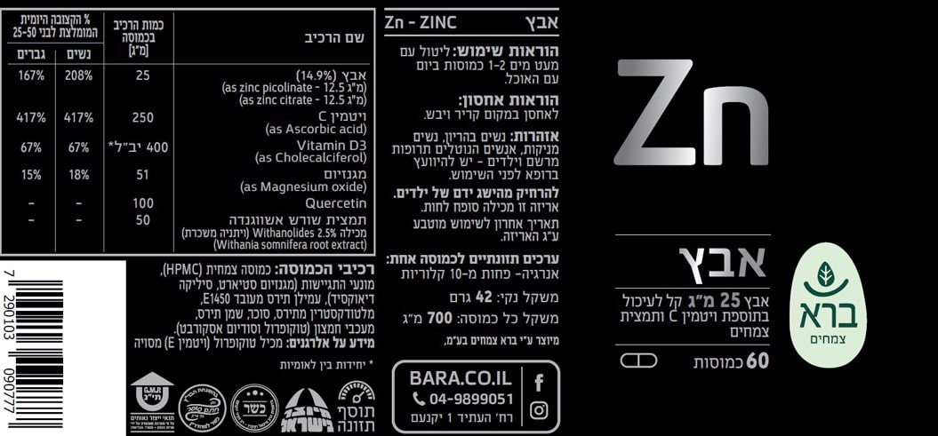 | אבץ 25 מ”ג | As Zinc picolinate 12.5 mg