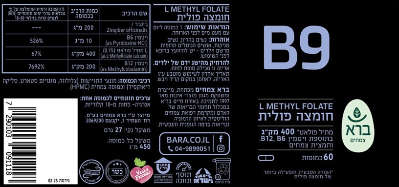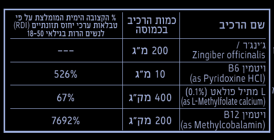400 מ”ג חומצה-פולית (מסוג מתיל-פולאט) בזמינות ביולוגית גבוהה, בתוספת ויטמיני B12(מתיל-קובלמין), B6 ותמצית שורש ג’ינג’ר