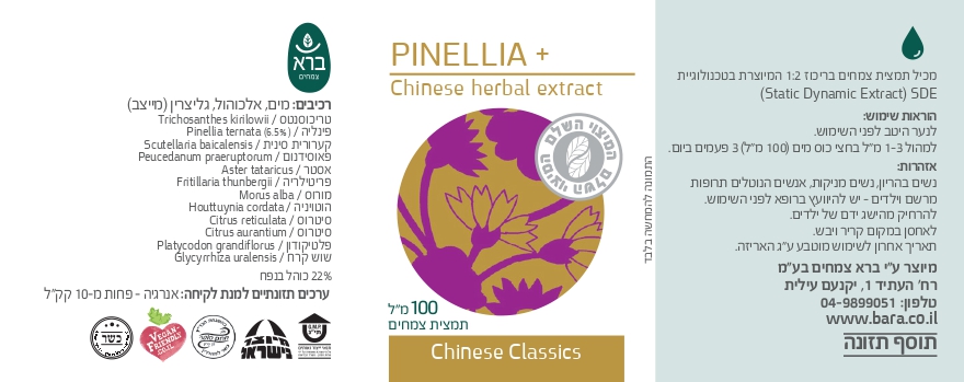 פורמולת הצמחים במיצוי נוזלי PINELLIA +, מורכבת מווריאציה על הרכב צמחים סיני קלאסי, שמקורו עוד במאה ה- 15 לספירה, בשם QING QI HUA TAN WAN שפירושו: “טיהור צ’י והתמרת נוזלים צמיגיים”.